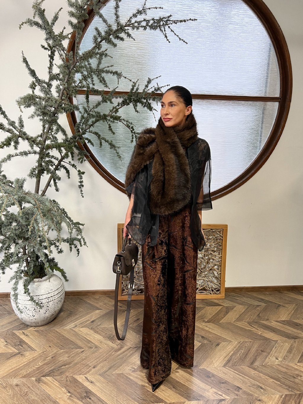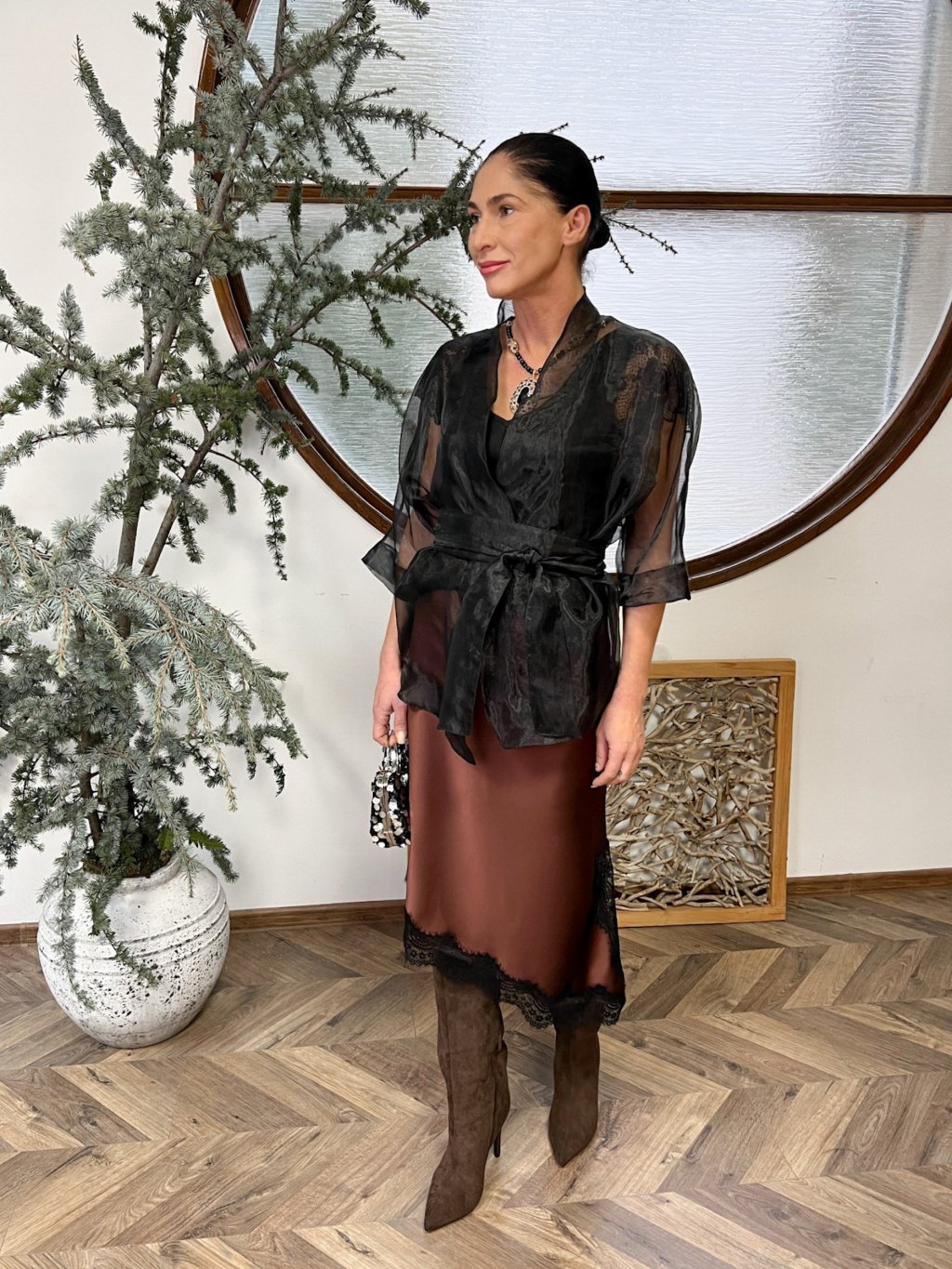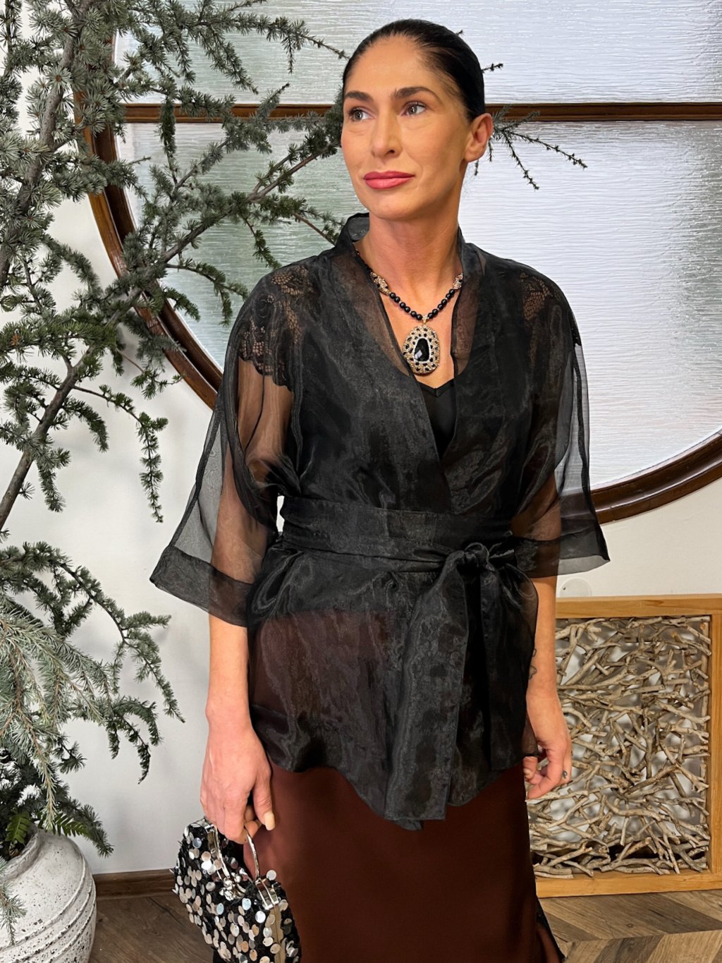 Dodajte svojmu outfitu nádych luxusu s týmto výnimočným kaftanom z jemnej priesvitnej organzy. Kaftan pôsobí ľahko, vzdušne a elegantne. Vpredu sa viaže širokou stuhou, ktorá dodá siluete ženskosť. Priesvitná štruktúra materiálu pôsobí zvodne, no stále veľmi vkusne. Kus, ktorý okamžite povýši každý outfit na vyšší level.