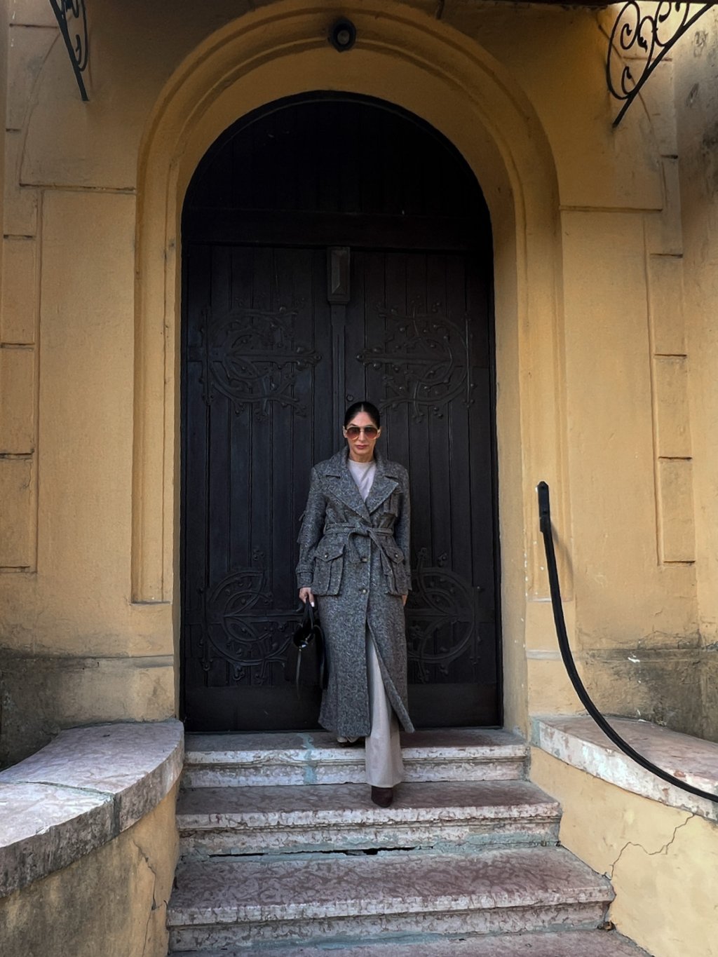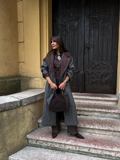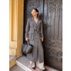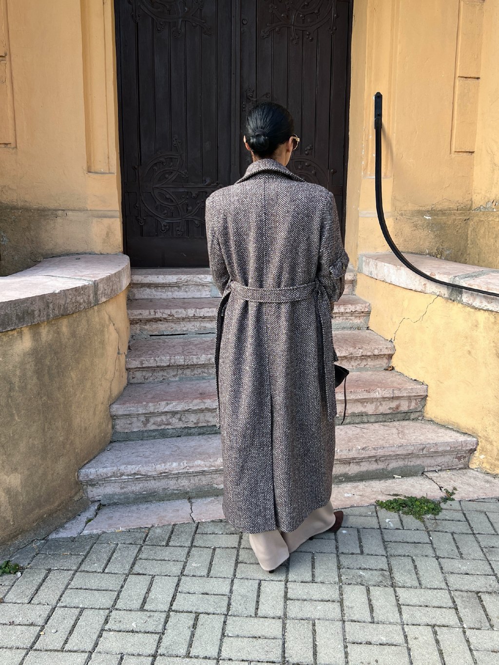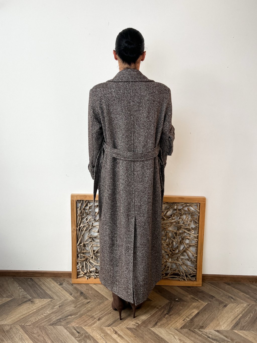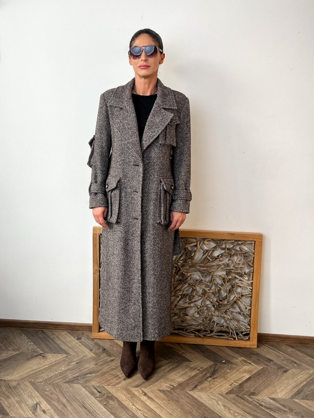Dlhý elegantný kabát MIA MIA z jemne štrukturovanej látky so vzorom rybej kosti dodá tvojmu outfitu šmrnc. Dvojradové zapínanie, opasok v páse a klasický golier zvýraznia ženskú siluetu. Kabát má praktické predné vrecká s ozdobnými pätkami, ktoré dotvárajú jeho elegantný vzhľad a zároveň poskytujú priestor na drobnosti či zahriatie rúk počas chladných dní.