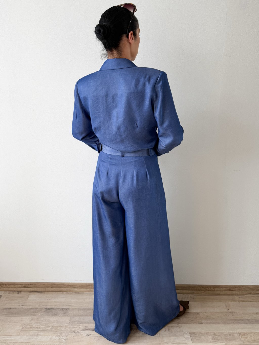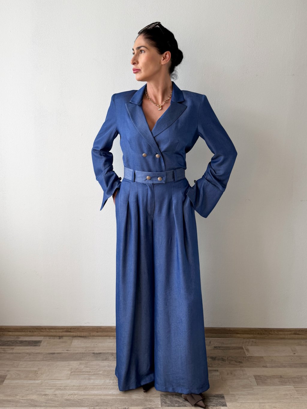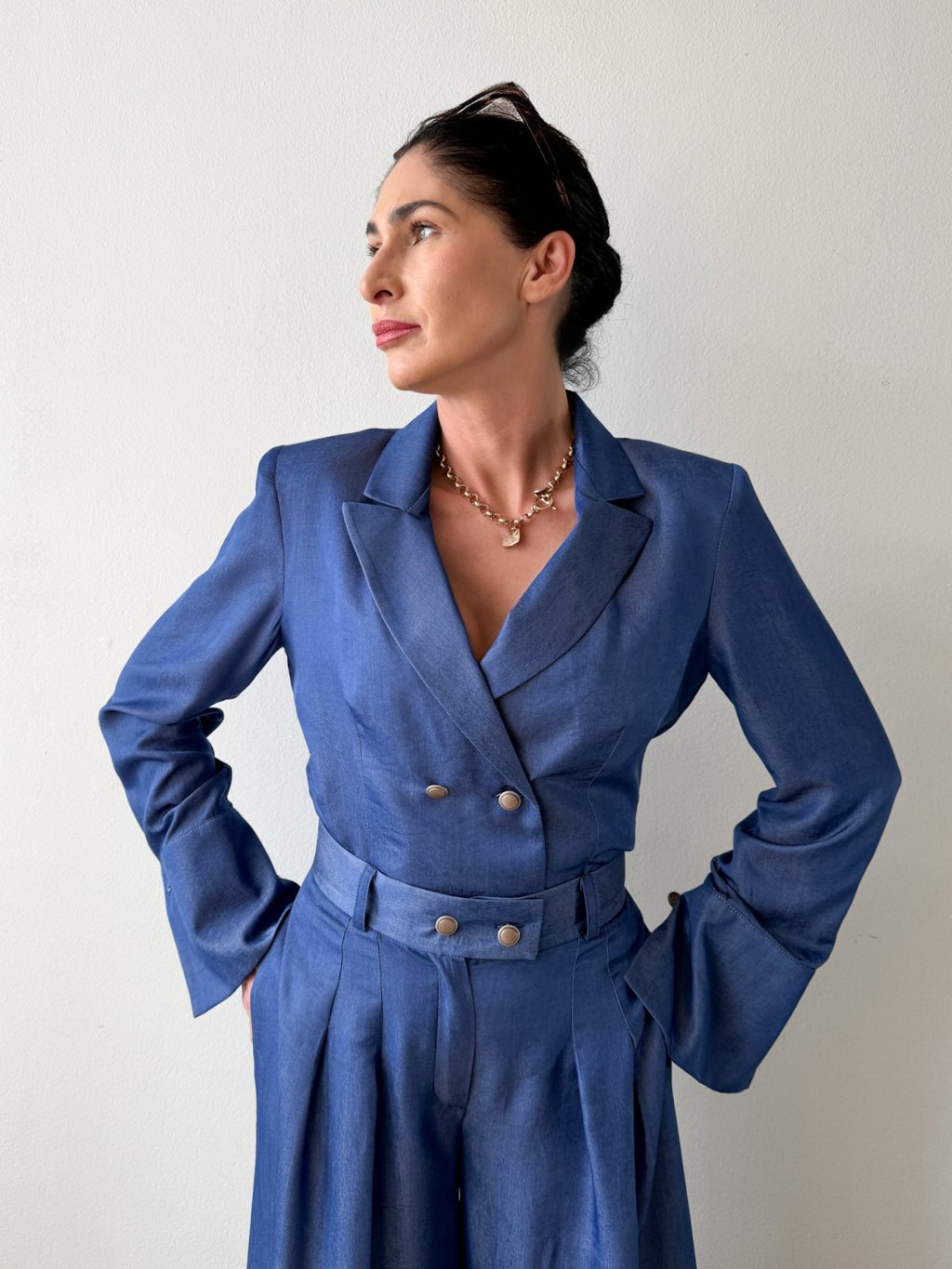 Strih s jemnými vypchávkami v ramenách krásne formuje postavu. Dvojradové zapínanie- elegantný charakter. Sako-blúzku je ideálne nakombinovať s našimi nohavicami LUCCA.