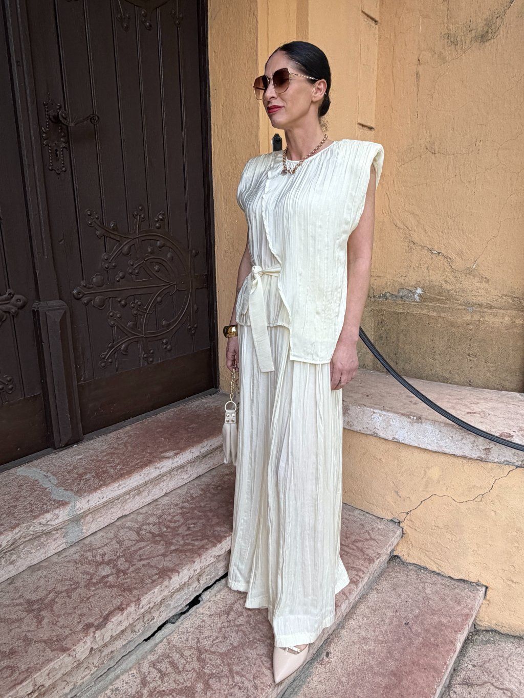Výrazné, mierne vystužené ramená. Vďaka jemnému viazaniu v páse si môžete prispôsobiť šírku podľa svojej postavy a zvýrazniť pás. Pre monochromatický vzhľad ho skombinujte s našimi širokými nohavicami.