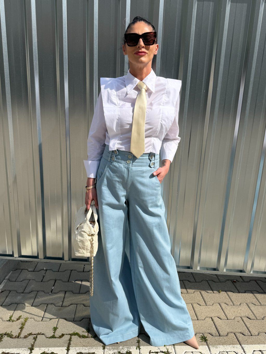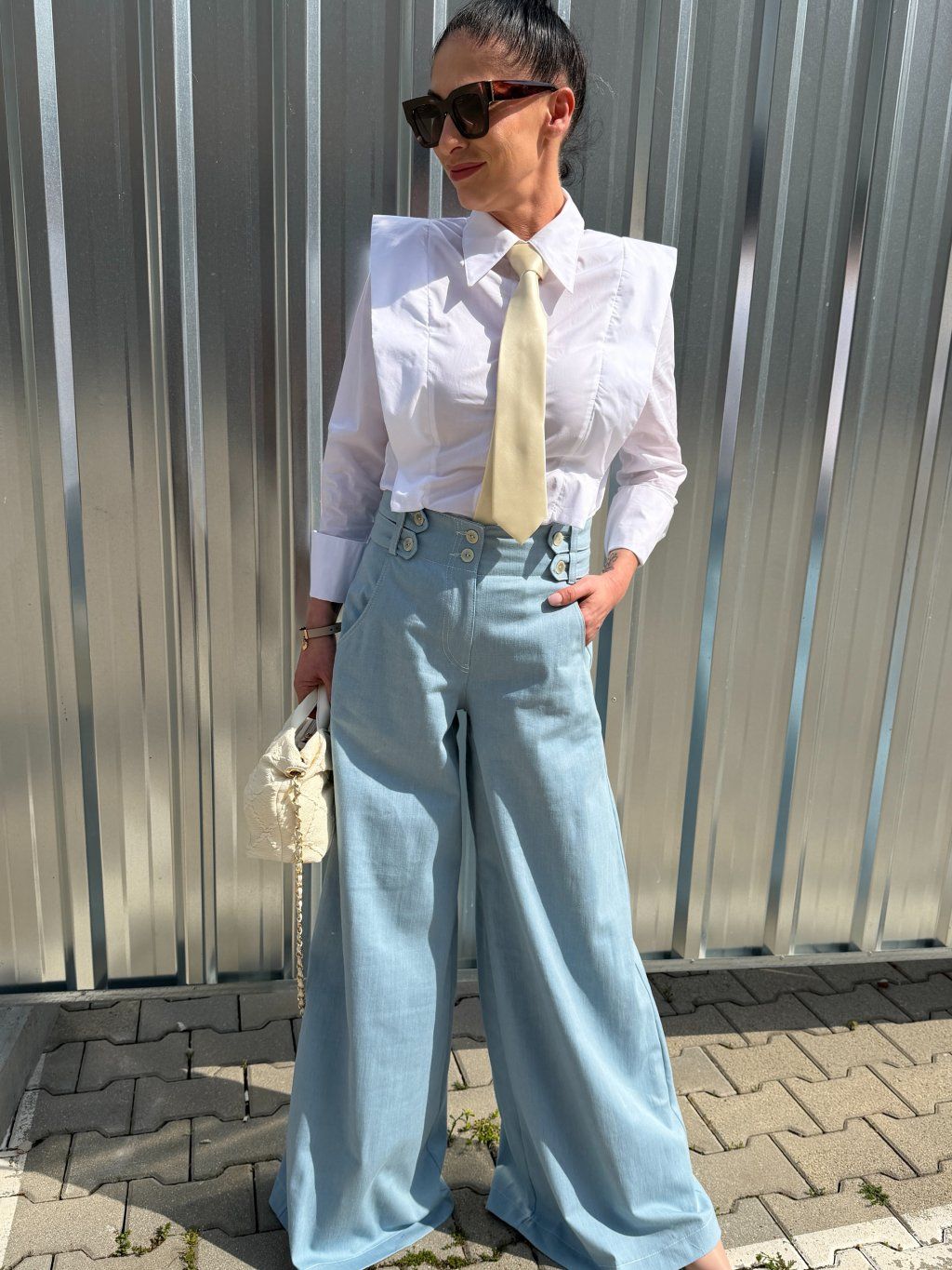Vysoký pás krásne tvaruje postavu. Dominantný prvok- prepracovaný pás s dekoratívnymi gombíkmi. Veľmi príjemné na nosenie