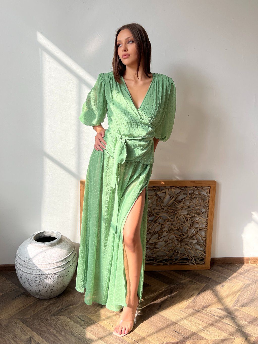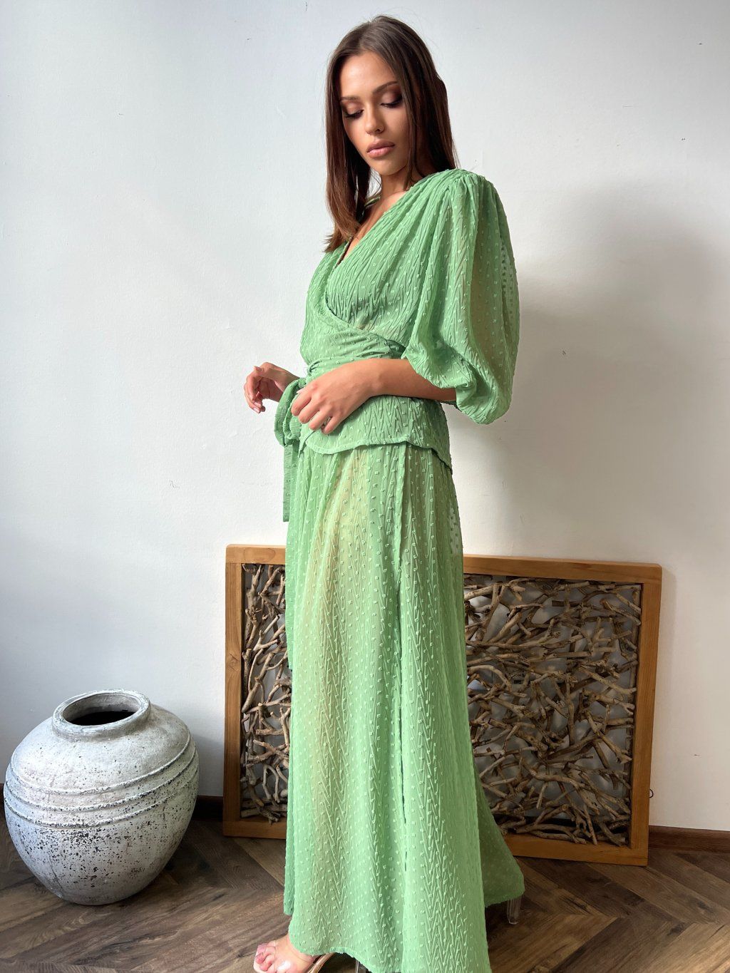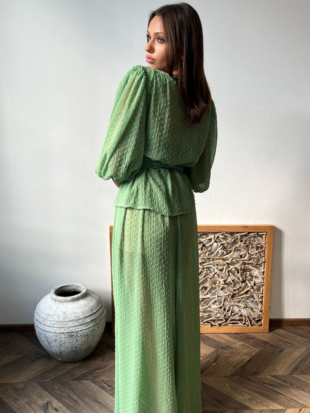 Padavé nohavice s hlbokými záhybmi a rozparkami, ktoré vytvárajú sebavedomý look.